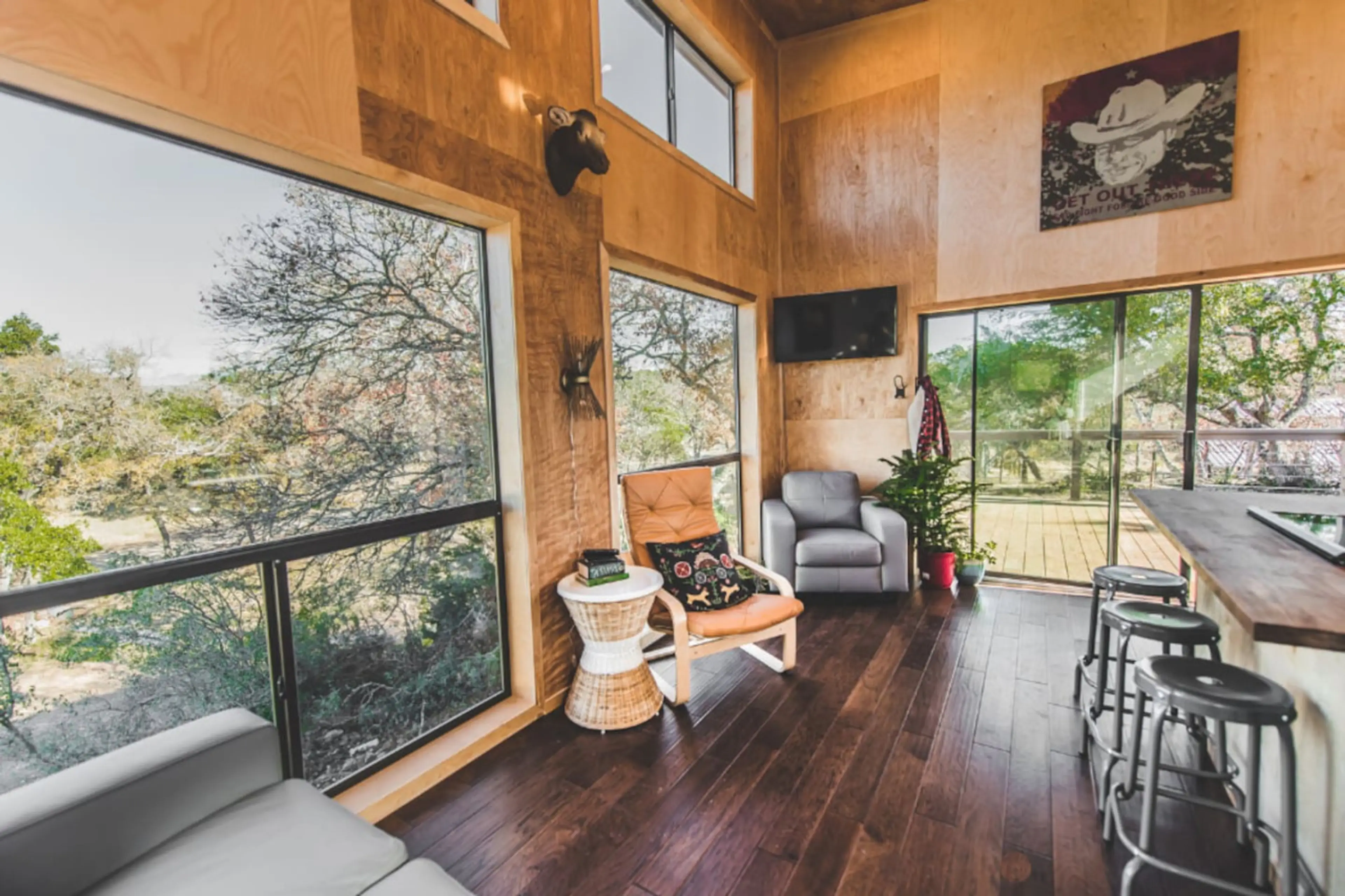 Just west of Austin in Dripping Springs, this farmhouse-modern cabin is perched on a hill at Wanderin' Star Farms looking out toward lots of local landscape and light! The cabin has a large porch with an oversized farm table, fiber internet, work table, roku tv, and a righteous coffee setup with op...